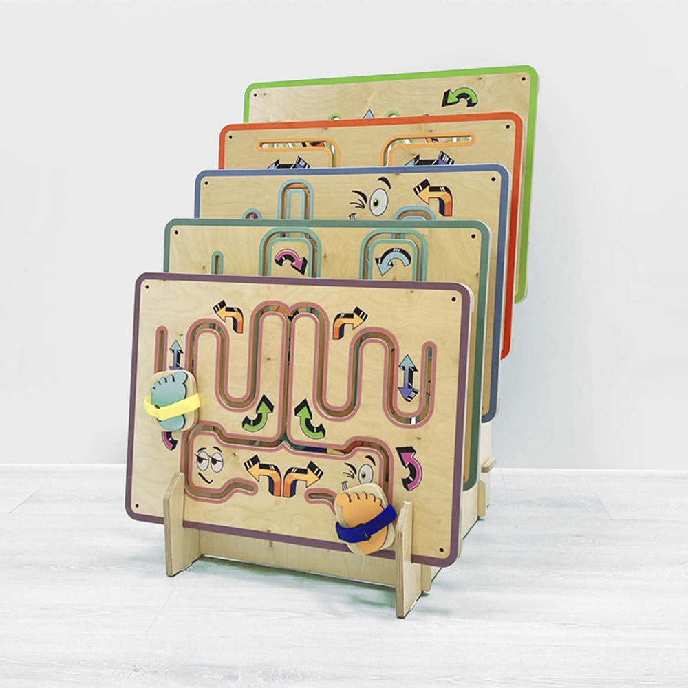 В комплекте идёт пять платформ-лабиринтов и подставка для них. Можно повесить все сразу, если позволяет помещение, можно только одну — и заменять платформы по мере надобности. В методическом пособии собраны варианты занятий, которые можно проводить с детьми.