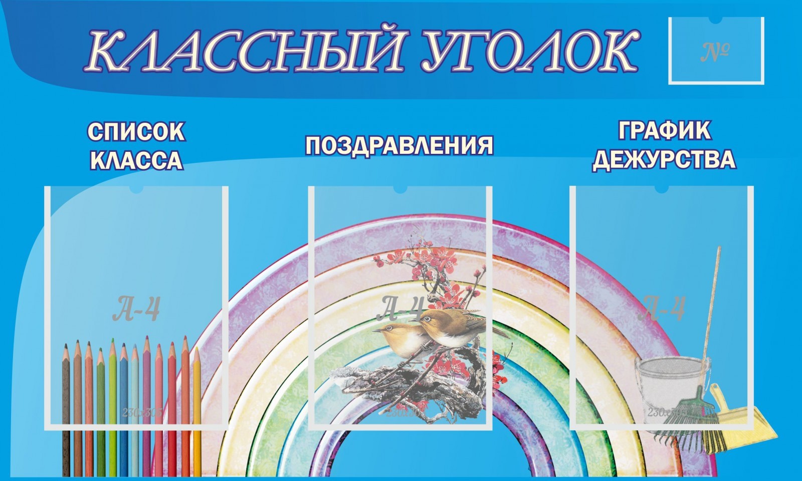 Каждый класс должен иметь свой стенд с определенной информацией. Этот стенд компактного размера. Он найдет место в любом классе, даже самом маленьком. Фон этого стенда выполнен приятного глазу синего цвета. Стенд оборудован тремя кармашками. Каждый карманчик имеет свое специальное назначение. И каждое назначение не только подписано (список класса, поздравления, график дежурства), но и обозначено графически. Так, например, график дежурства обозначен веселыми метелкой, совочком и ведрышком. Стенд выполнен из пластика и достаточно мобилен, поэтому его можно легко переносить в другой класс.