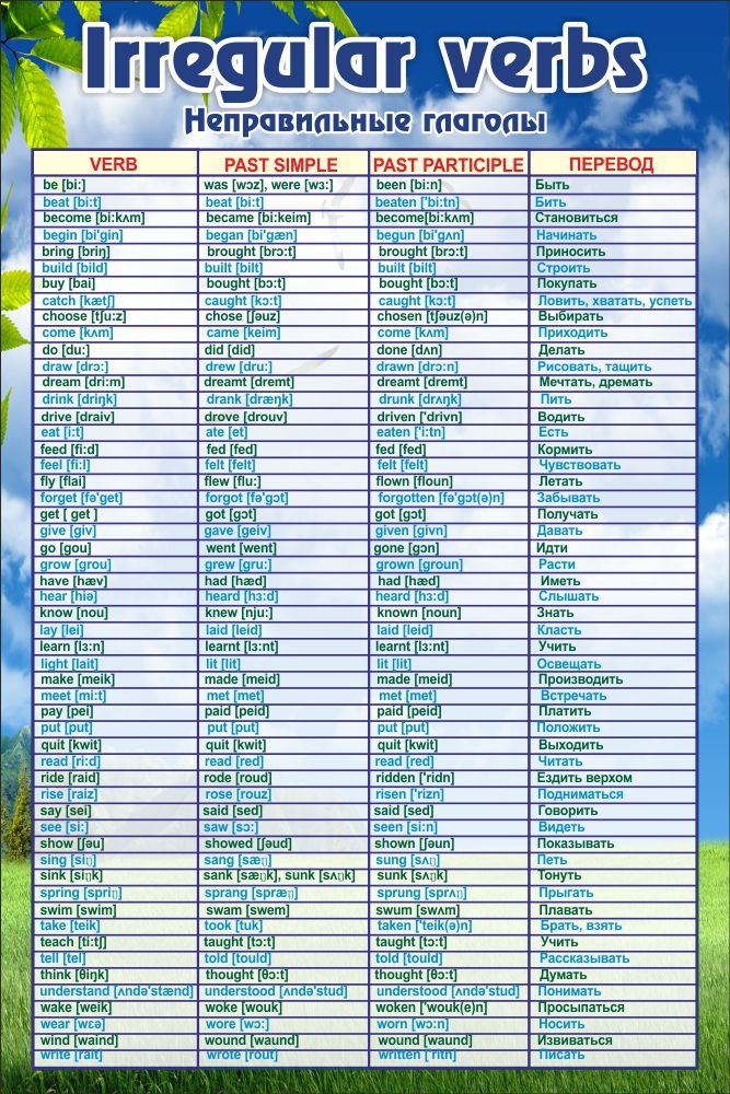 Самое трудное в английском языке не сложная грамматика, не изучение слов, не шестнадцать времен, а исключения из правил. В основном, это неправильные глаголы. В английском языке более пятисот неправильных глаголов, у которых по три формы. Ученики при виде этого огромного списка слов теряются, и желание изучать английский язык у них отпадает. Но для свободного общения необходимо знать значительно меньше неправильных глаголов. На этом стенде написаны самые распространенные глаголы, который должен знать каждый ученик, изучающий английский язык, чтобы в дальнейшем он смог свободно говорить на этом языке.