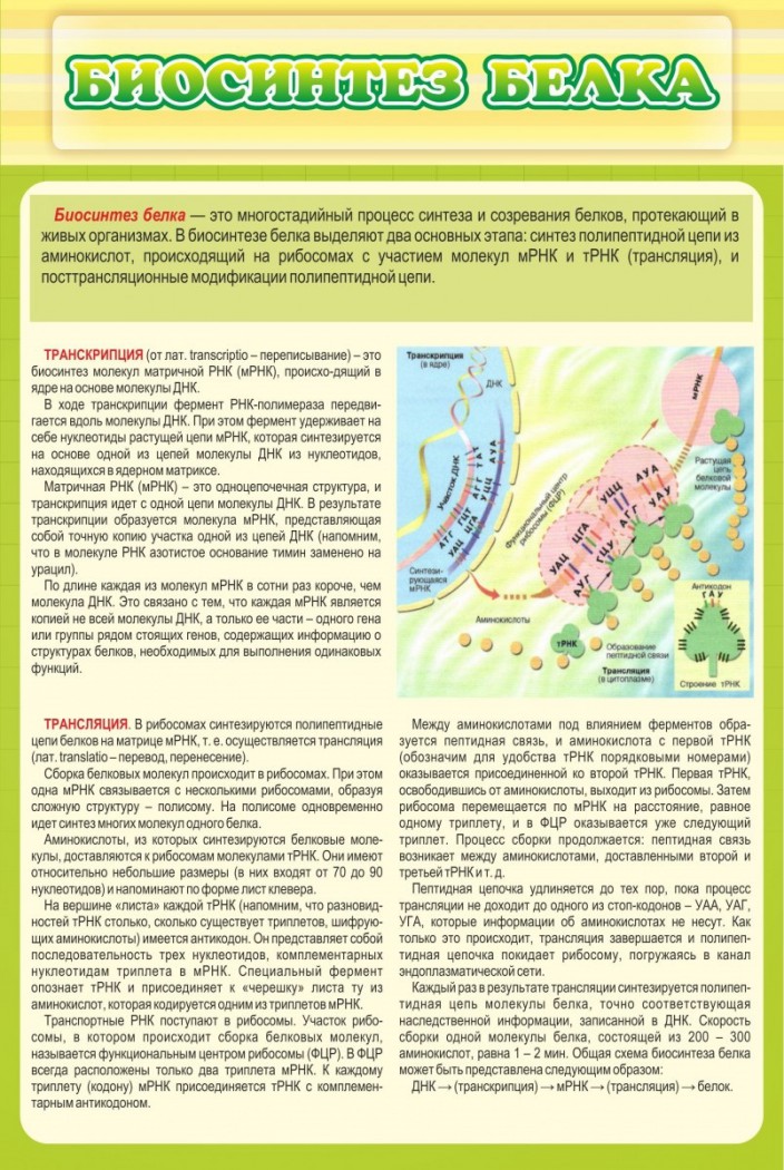 Прямоугольный стандартный настенный школьный стенд, в схематичной форме рассказывающий о биосинтезе белка, будет отличным учебным пособием для учеников среднего и старшего школьного звена. Определение понятия биосинтез белка, выделение двух его основных этапов, транскрипция (биологическое значение термина),  трансляция (биологическое значение термина)  и опорная схема взаимопревращения 3 основных макромолекул: рибонуклеиновая кислота,  дезоксирибонуклеиновая кислота и белок.
