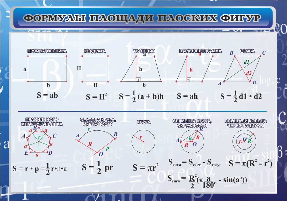 Главная Каталог Стенды Кабинеты Математика Стенд "Формулы площади плоских фигур"