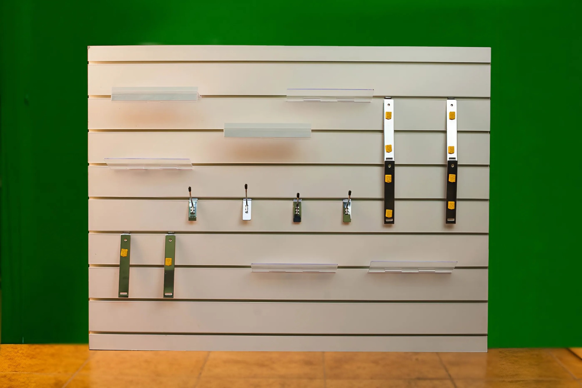 Стенд представляет собой ламинированный щит с пазами для крепления аксессуаров: набора полок, крюков, магнитных держателей и подвесок. Аксессуары вставляются в пазы щита и размещаются на стенде в удобном для экспозиции месте.