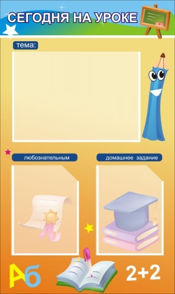 Этот яркий стенд включает один кармашек А3 и два кармана А4. Невероятно привлекательный дизайн, будет радовать весь класс, и побуждать к хорошей учебе всех школьников. Одно окно с карманом под названием «Тема», а два других кармана называются «Любознательным» и «Домашнее задание». Забавный дизайн стенда полон самыми яркими красками. Но учиться, это вряд ли помешает, хотя бы одному школьнику младших классов. Собственно, стены кабинетов подобных маленьких учеников, обычно и украшены самыми яркими и необычными стендами. Так что этот вариант отлично подойдет. Следует вкладывать в кармашки любую необходимую информацию.