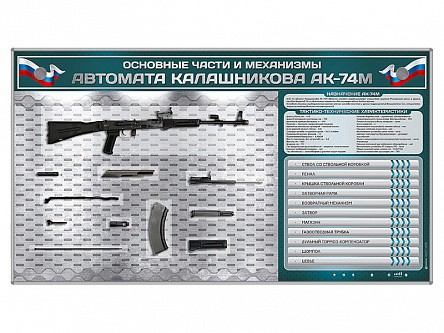 Электрифицированный стенд представляет собой информационную панель с раздельной секционной световой индикацией, на которой размещены полноразмерные, оригинальные макеты механизмов и деталей автомата Калашникова АК-74М. Стенд предназначен для использования на учебных занятиях по предмету НВП, при изучении которого необходима информация о том, из чего состоит автомат Калашникова и как выглядят его основные части и механизмы. Стенд позволяет наглядно знакомить учащихся или курсантов с комплектацией автомата в классе военной подготовки. Программным обеспечением стенда предусмотрена функция "Виртуальный учитель", представляющая собой голосовое сопровождение, которое рассказывает о комплектации автомата. Выбор компонента, о котором информирует "Виртуальный учитель", происходит при помощи сенсорного беспроводного пульта дистанционного управления.