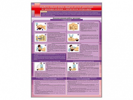 Стенд представляет собой информационную панель, на которой размещены сведения о работе с тренажером-манекеном. Стенд предназначен для наглядного отображения информации о приемах сердечно-легочной реанимации на тренажере-манекене с электрическим контроллером, а также для формирования у учащихся, курсантов или сотрудников предприятий знаний об оказании первой помощи.