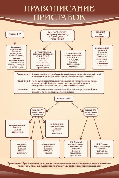 Практически всем ученикам очень трудно дается школьная программа русского языка, и в особенности многим тяжело уяснить все правила написания приставок. На помощь преподавателю был разработан специальный стенд «Правописание приставок», на котором подробно в схематичном порядке разобраны все известные приставки и правописания русского языка, что очень хорошо помогает учащимся уже при одном прочтении понять материал. Этот стенд преподаватель сможет применять как наглядное учебное пособие для учеников повышая их уровень образования и усиливая общую успеваемость школы.