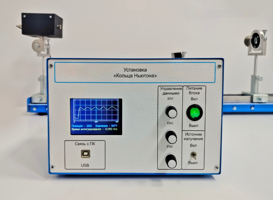 Приемный блок – линейка, состоящая из приборов с зарядовой связью. Линейка установлена в корпус. Конструкция блока позволяет изменять угол наклона линейки относительно оптической скамьи. Линейка подключена к блоку обработки данных.