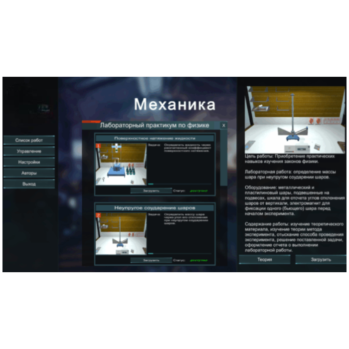 Виртуальный лабораторный практикум предназначен для изучения основных положений механики и позволяет изучить виртуальные лабораторные работы: