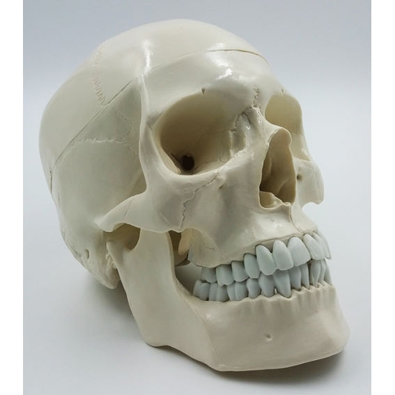 Модель высотой ≈ 15см, изготовлена из пластмассы. Модель позволяет рассмотреть строение черепа и продемонстрировать расположение костей черепа относительно друг друга.