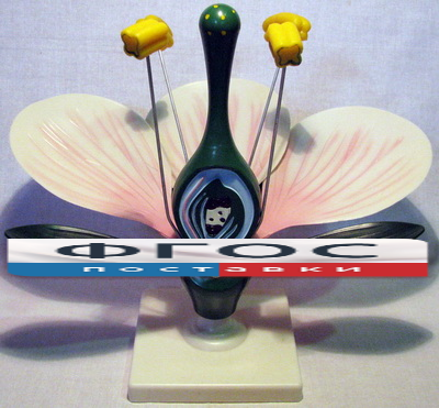 Модель цветная, изготовлена из пластмассы, представляет собой увеличенный цветок яблони в разрезе. Она является цветной, разборной – чашелистики (4шт.) и лепестки (3шт.) вставляются в пазы на цветоложе модели цветка. Модель позволяет рассмотреть особенности внешнего и внутреннего строения цветка яблони, а также внутреннее строение завязи пестика. Высота модели цветка яблони не менее 35 см. На модели можно рассмотреть следующие детали строения: цветоножка, цветоложе, чашелистики, лепестки венчика, тычинки (тычиночные нити и пыльники), пестик (рыльце, столбик, завязь), пыльцевая трубка, семяпочка, семязачаток, яйцеклетка, центральная клетка.