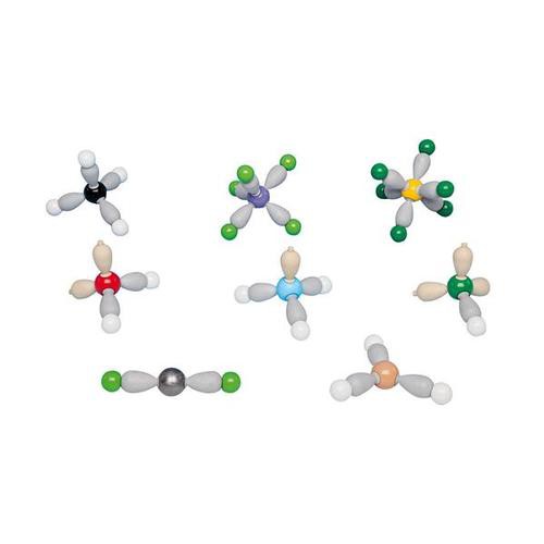 Набор содержит компоненты, необходимые для сборки 8 указанных атомных моделей. Разные формы являются примерами разной ориентации связей и охватывают координационные числа от 1 до 6. Неподеленные пары электронов представлены коричневыми сферами или коричневыми грушевидными компонентами. Два дополнительных грушевидных компонента, содержащиеся в наборе, позволяют собирать протонированные модели для демонстрации, в частности, теории кислот и оснований и образования H3O в результате переноса H+ от хлороводорода.
