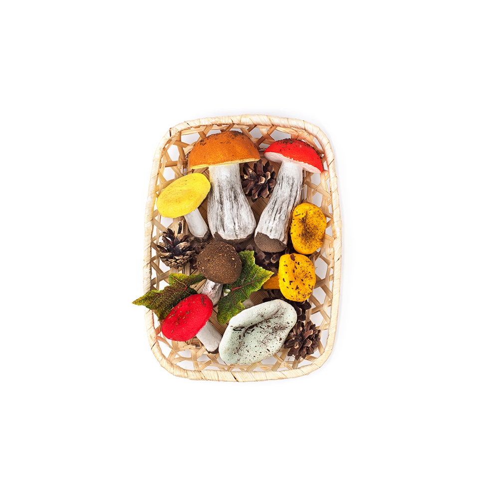 Наглядно-демонстрационное пособие из муляжей распространенных видов грибов рассчитано на использование в школе начального и среднего звена при проведении уроков изобразительного искусства, природоведения, биологии и на других предметах, связанных с рассмотрением этого царства. Модели отличаются натуралистичностью, форма, размер и цвет соответствуют натуральным образцам. Дополняется набор декоративной корзинкой, натуральными еловыми и сосновыми шишками, искусственными листьями.